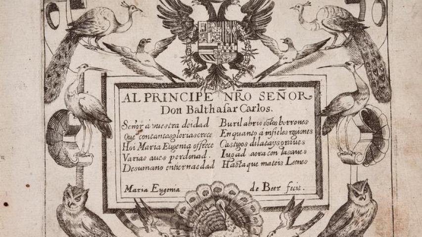 Otra obra de un relevante jesuita, el padre Francisco Aguado, que fue ministro de Olivares en diversas juntas de gobierno y confesor suyo, y titulada Sumo sacramento de la fe, tesoro del nombre christiano. (1640), luce una de las portadas alegóricas en frontispicio tan características en María Eugenia. El ejemplar se encuentra igualmente en las Descalzas [MD/B/127].